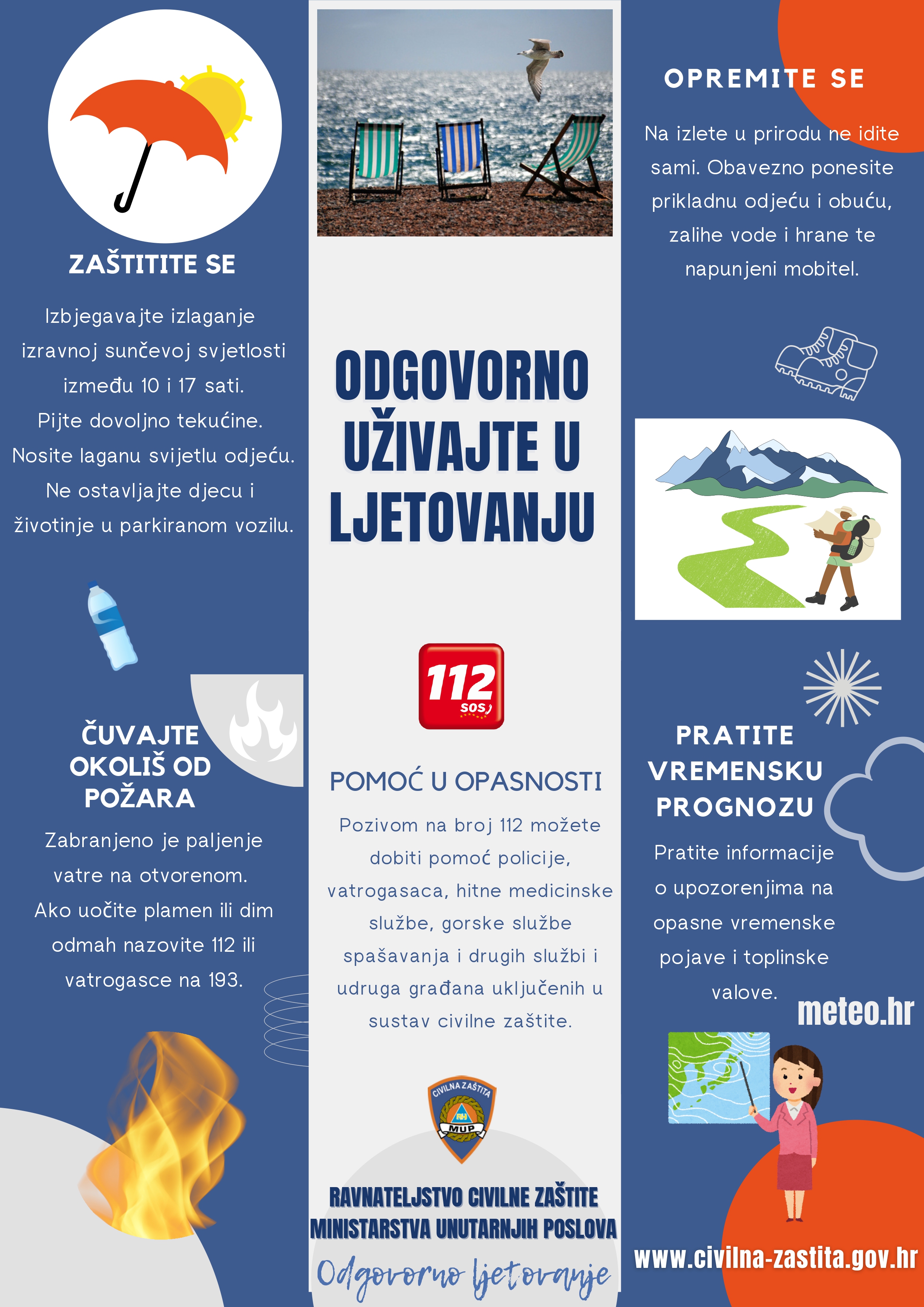 U namjeri što boljeg preventivnog informiranja građana i turista o odgovornom ponašanju te pravilnim reakcijama u ljetnom razdoblju, Ravnateljstvo civilne zaštite i ove godine nastavlja s kampanjom „ODGOVORNO LJETOVANJE“. Prenosimo informativni plakat „ODGOVORNO LJETOVANJE“, na hrvatskom i engleskom jeziku.