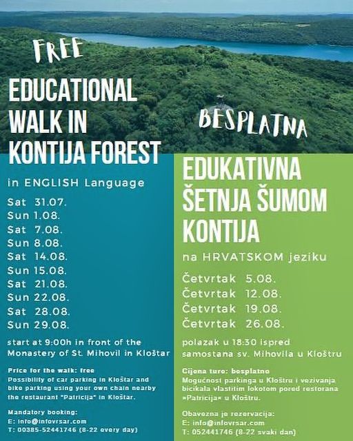 Rezervirajte mjesto na vrijeme i ne propustite ovu jedinstvenu priliku za upoznavanje bogatstva biljnog i životinjskog svijeta posebnog rezervata šumske vegetacije Kontija i uživanje u prirodnim ljepotama ovog zaštićenog područja.